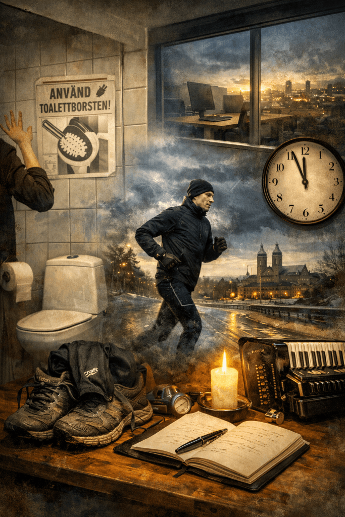 Men kasten är handskad, tänker jag på femte våningens toalett där jag gör min dagliga moonwalk för att sensorerna ska registrera min närvaro och tända belysningen, så att jag inte kissar snett och förargar övriga gäster. Över toaletten har någon klistrat en lapp som beskriver vad en toalettborste är.