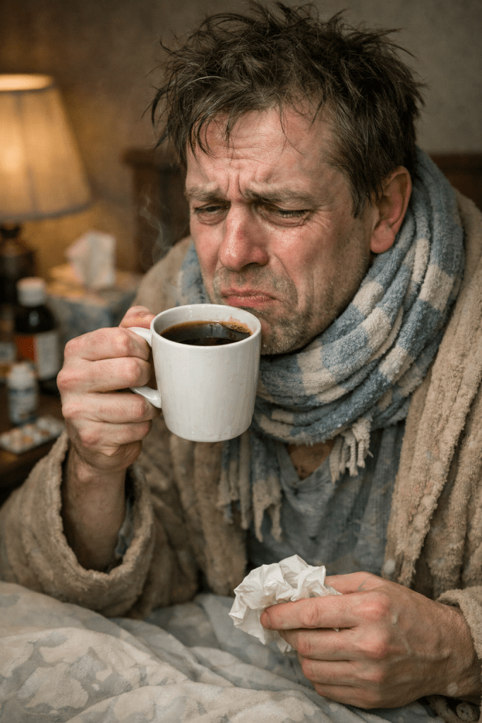 Ett tecken på att det ändå går i rätt riktning är att jag i dag har tagit min kaffetermos med mig till jobbet och känner smaken av kaffe. När jag prövade en kopp förra helgen smakade det kloak. Hela min kropp har varit en kloak, och det mer än vanligt.